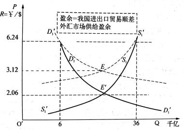 事實上,當我國外貿(mào)商品外匯供給與需求彈性較大時,如D,與S:運行所示,人民幣貶值10%,即可以實現(xiàn)均衡。不過,由于經(jīng)濟機理作用,均衡的E點并不是我們初始狀態(tài)的缺口4000億美元。因為供需曲線運行后交于E點,E點標識的均衡外匯供需市場規(guī)模是10000億美元,缺口是2000億美元。這2000億美元是我們通過國際物流達到如D:與S所示,人民幣需要貶值100%才可以達到均衡。同樣,這時的E’點標識的均衡外匯供需市場美元規(guī)模是10000億美元,缺口是2000億美元。這2000億美元是我們通過人民幣貶值達到的可預期的物流出口貿(mào)易規(guī)模。